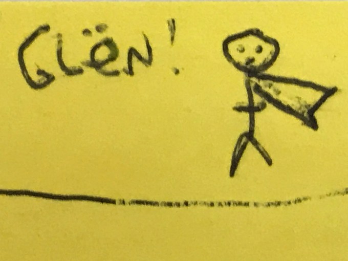 Meet GLëN, a biro stick figure superhero, pictured above as he appears on my fridge. He’s there where my primary school-aged sons can see him, to remind them of the four things he stands for.