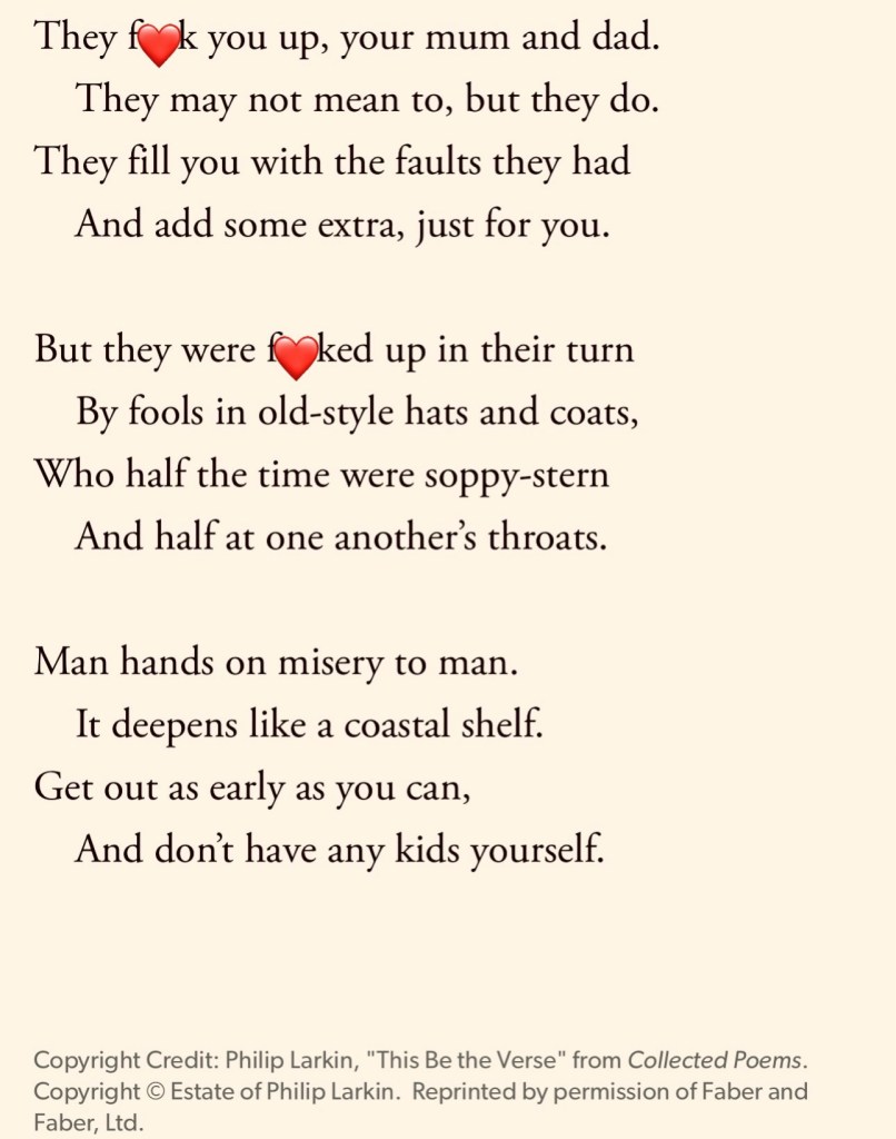 This Be The Verse by Philip Larkin has to be the Blur Song 2 of poetry, a short concussive blast that’s over before it began but has lingered in public imagination like none of the worthy remainder of the artist’s repertoire has.