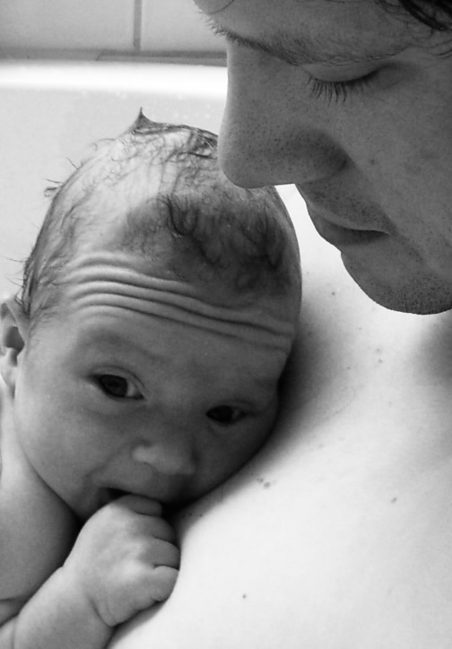 This photo was taken when my baby and his fatherhood (it belongs to him) were 2 weeks old. He’s moulded to my chest in the bath, and looking at the photo now I can still feel the warmth, how good and right that felt.