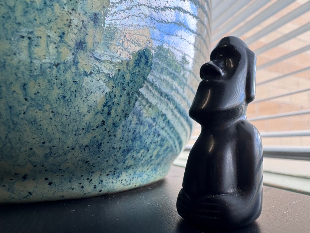 I wound up using the Moai statuettes and imagery in future sessions with this patient. We worked out that if I found myself slowing and deepening my voice, there was something in the room with us, about her need to slow down with me. Before long that way with one patient became a tool in my therapeutic toolbox; I use it quite a lot now, with dads and mums alike, and even with babies and small children in the room.